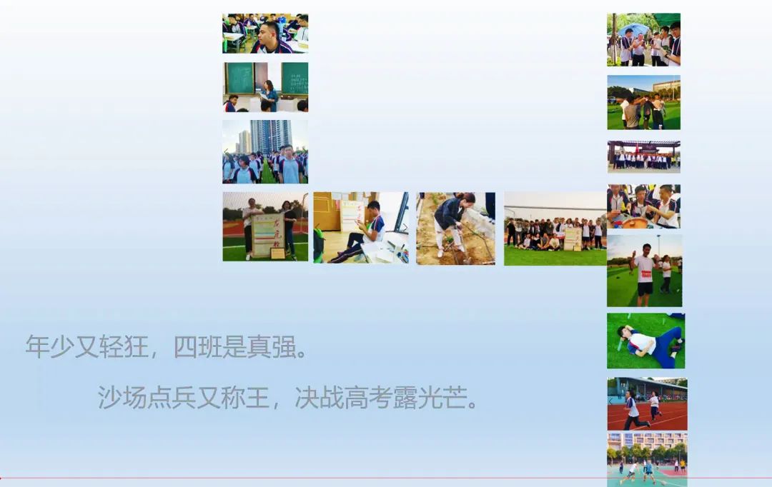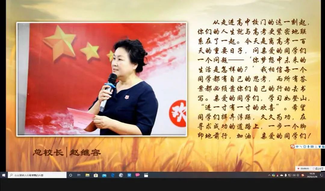 士气已燃,恩师助力。尽管以幻灯片的方式播放,老师们的形象与寄语却显得如此真切。他们用极具学科特点的语言,为同学们鼓劲激励。有些老师还现场连麦,肯定了同学们三年来的表现,表达了百日后即将离别的不舍,当然,最重要的是送上燃情的鼓励与诚挚的祝福。十年磨一剑,百日之后见锋芒!