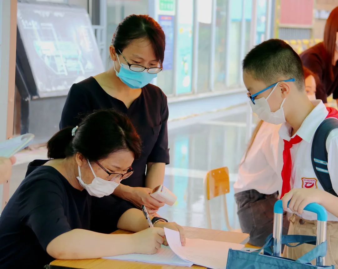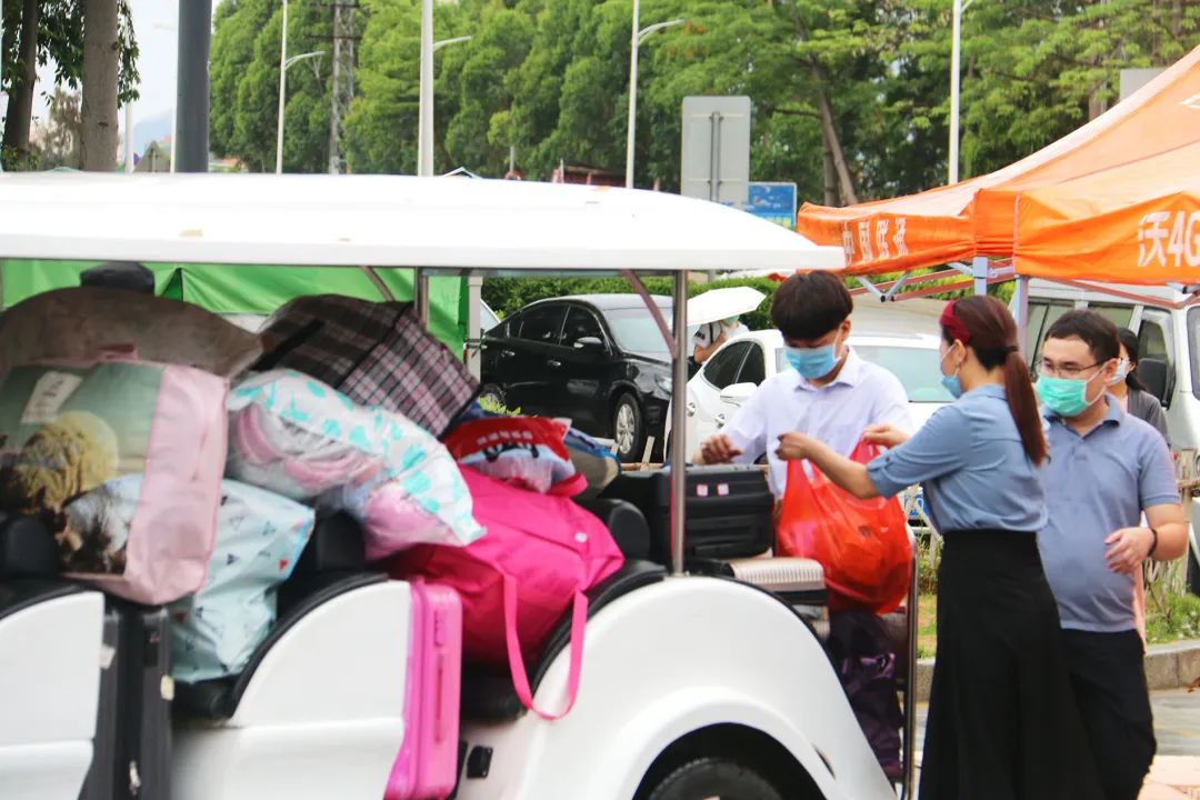 由于疫情防控需要,家长无法进入校园,学校的老师们主动承担起了孩子们的行李搬运工作。