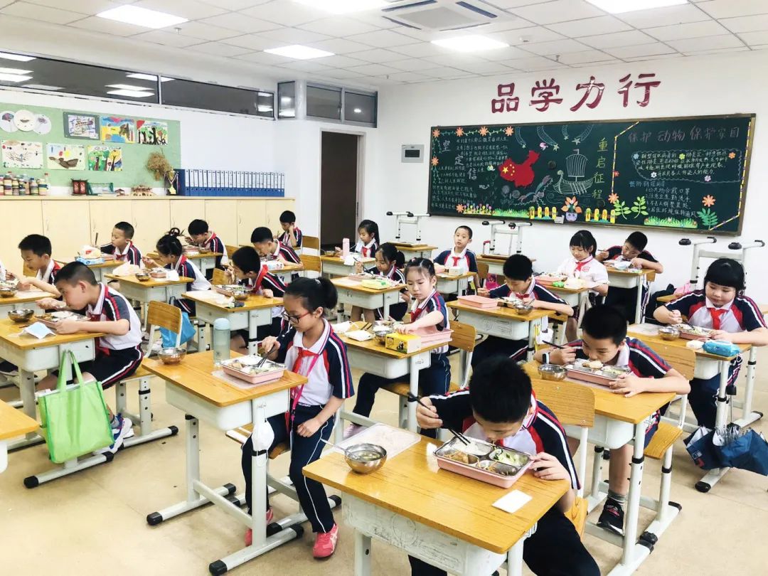 同学们严格遵守就餐的要求,消毒洗手后排队取餐,在教室单人单桌品尝美味。