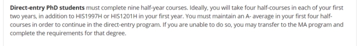 直升博士项目申请者必须完成九个时长为半年的课程。理想而言,你在大学前两年会完成其中四个课程,此外,第一学年还需要完成HIS1997H和HIS1201H 。学生前两年的课程平均成绩必须达到A-,才能继续完成直升博项目。如果学生无法达到此标准,可以选择转到研究生课程,根据要求完成硕士学位的学习。