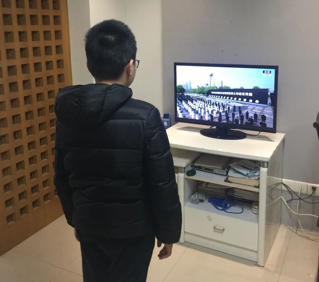 在警钟和鸣笛声中,师生们进行默哀……