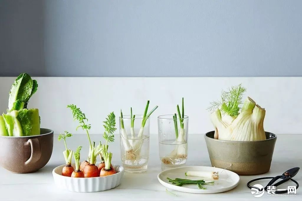 切取蔬菜的根茎部分,浸泡在水杯中,