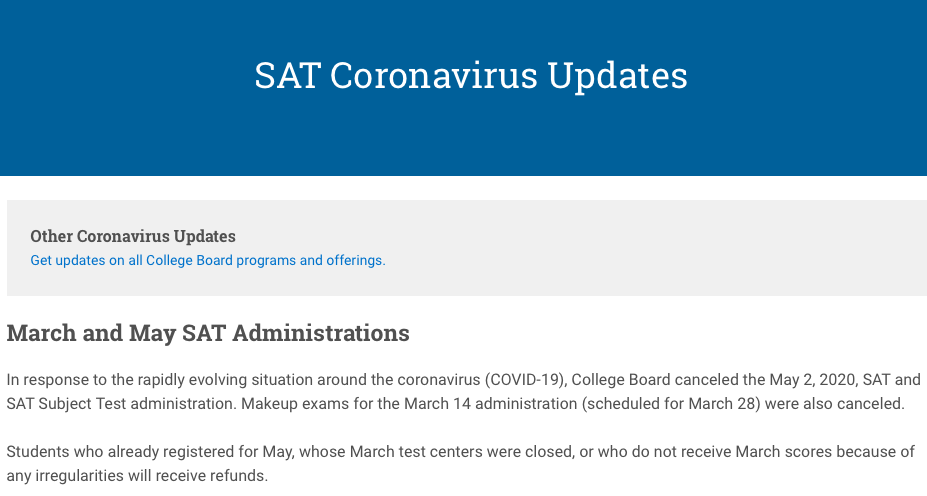 受新冠肺炎疫情影响,College Board 已于3月17号凌晨宣布取消原定于5月份举办的SAT考试。原定6月份的考试暂未取消。