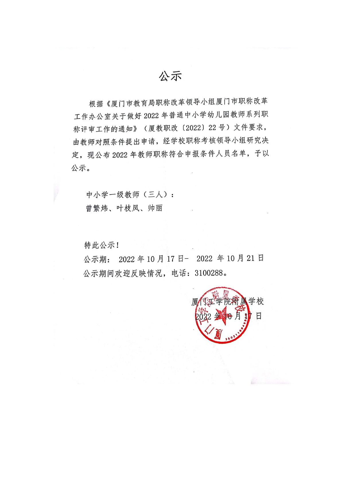 2022年厦门工学院附属学校一级职称申报人员公示(盖章扫描)