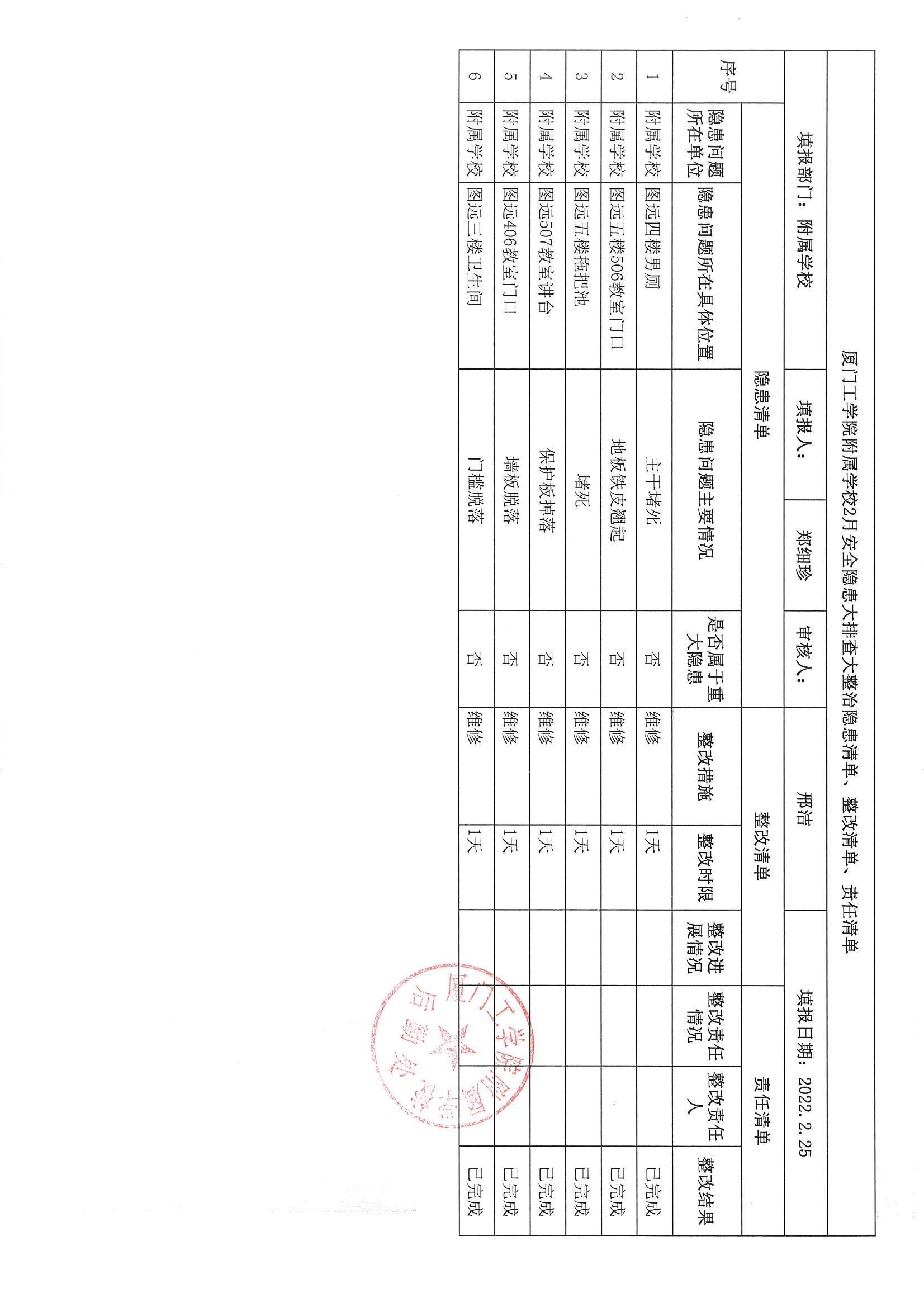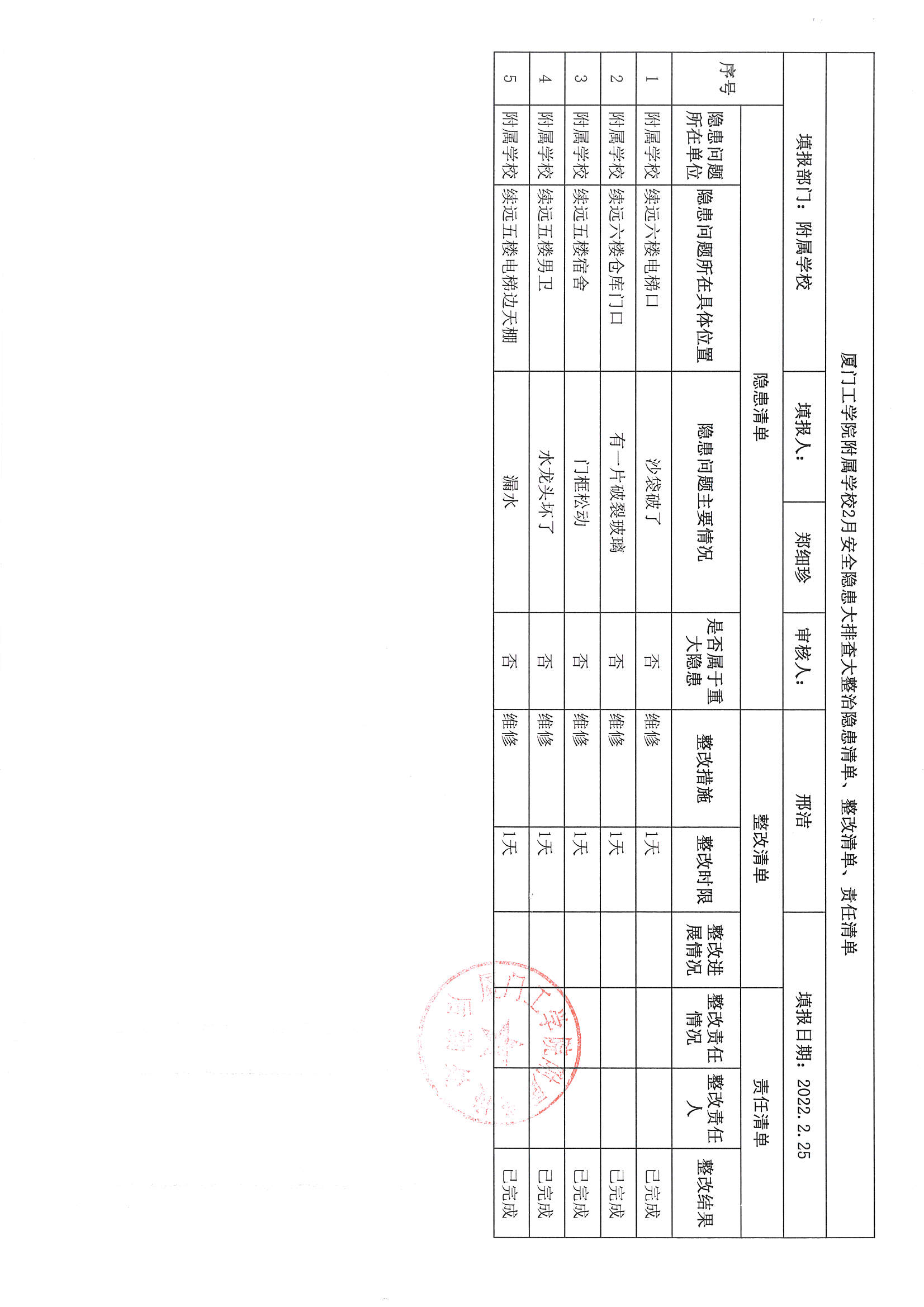 厦门工学院附属学校2022年2月份安全隐患大排查大整治隐患清单、整改清单、责任清单