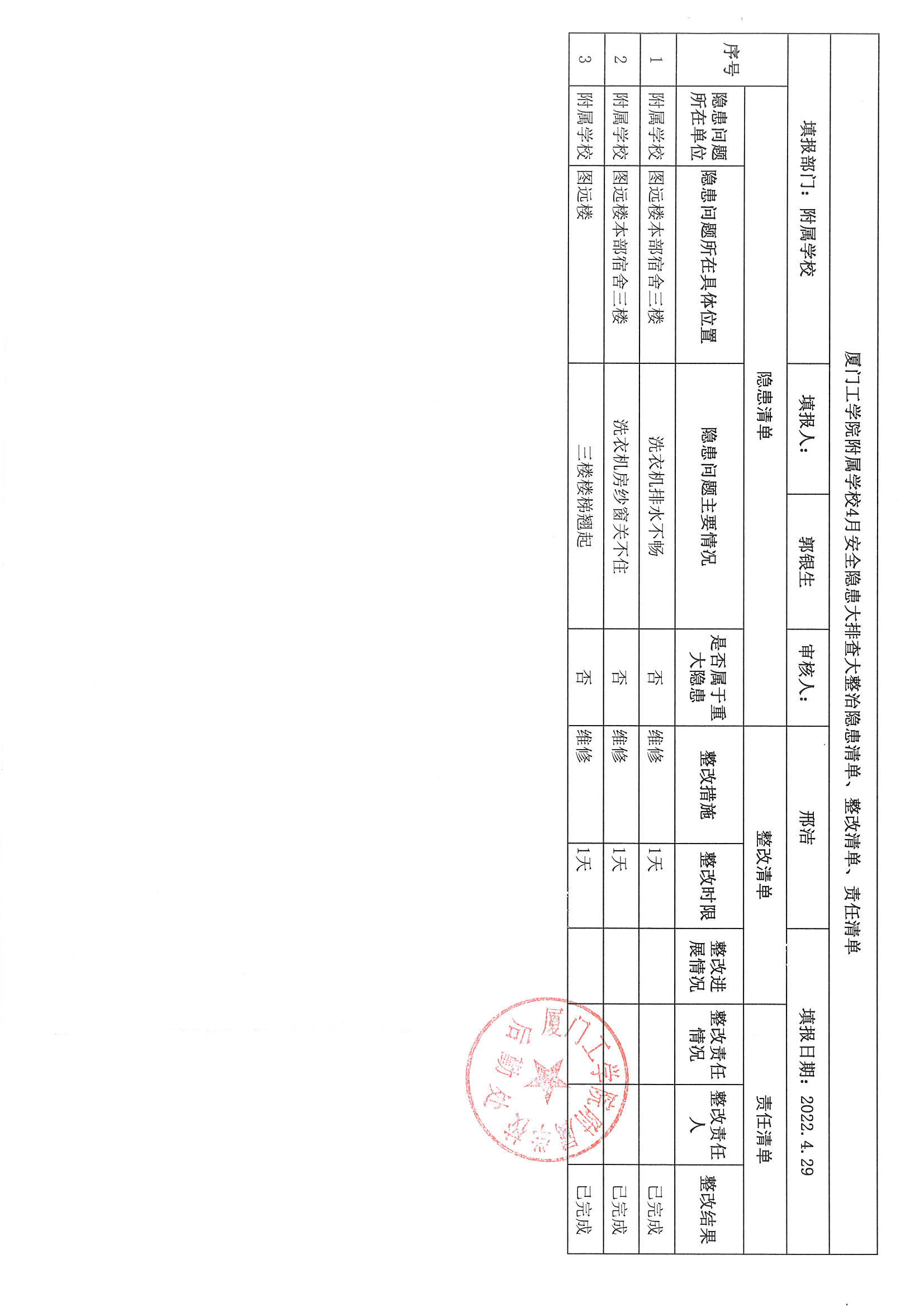 厦门工学院附属学校2022年4月份安全隐患大排查大整治隐患清单、整改清单、责任清单