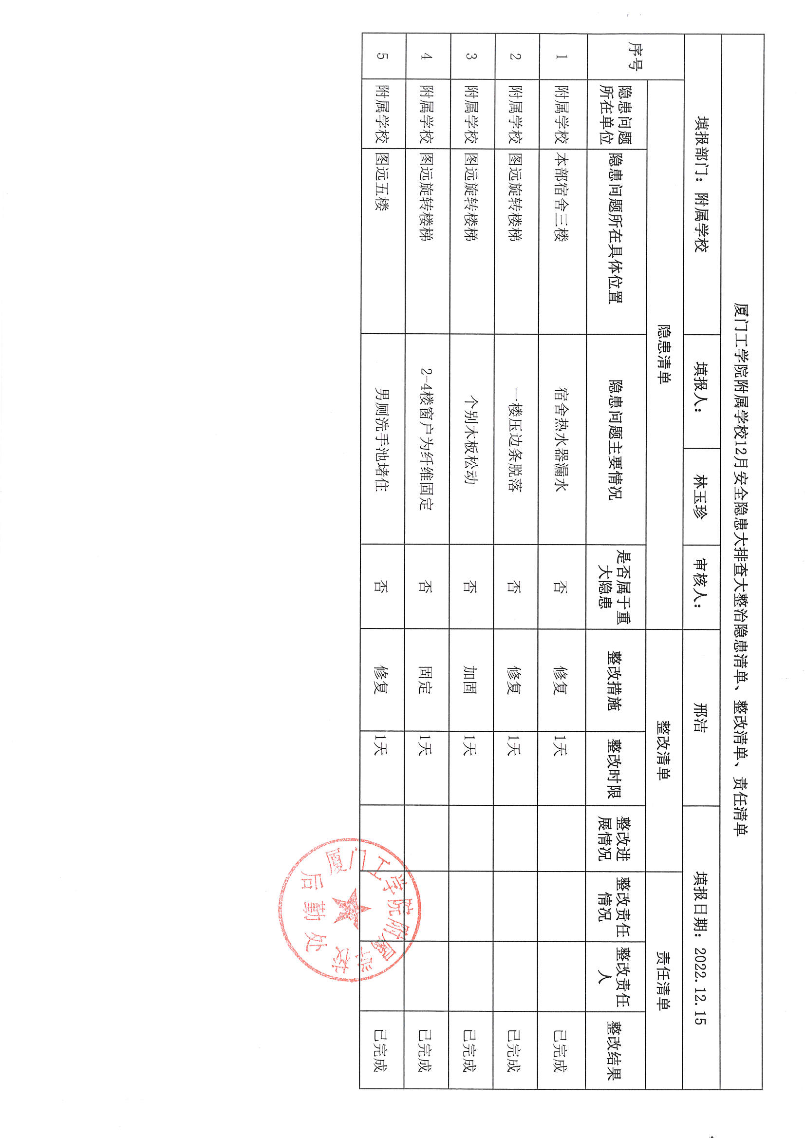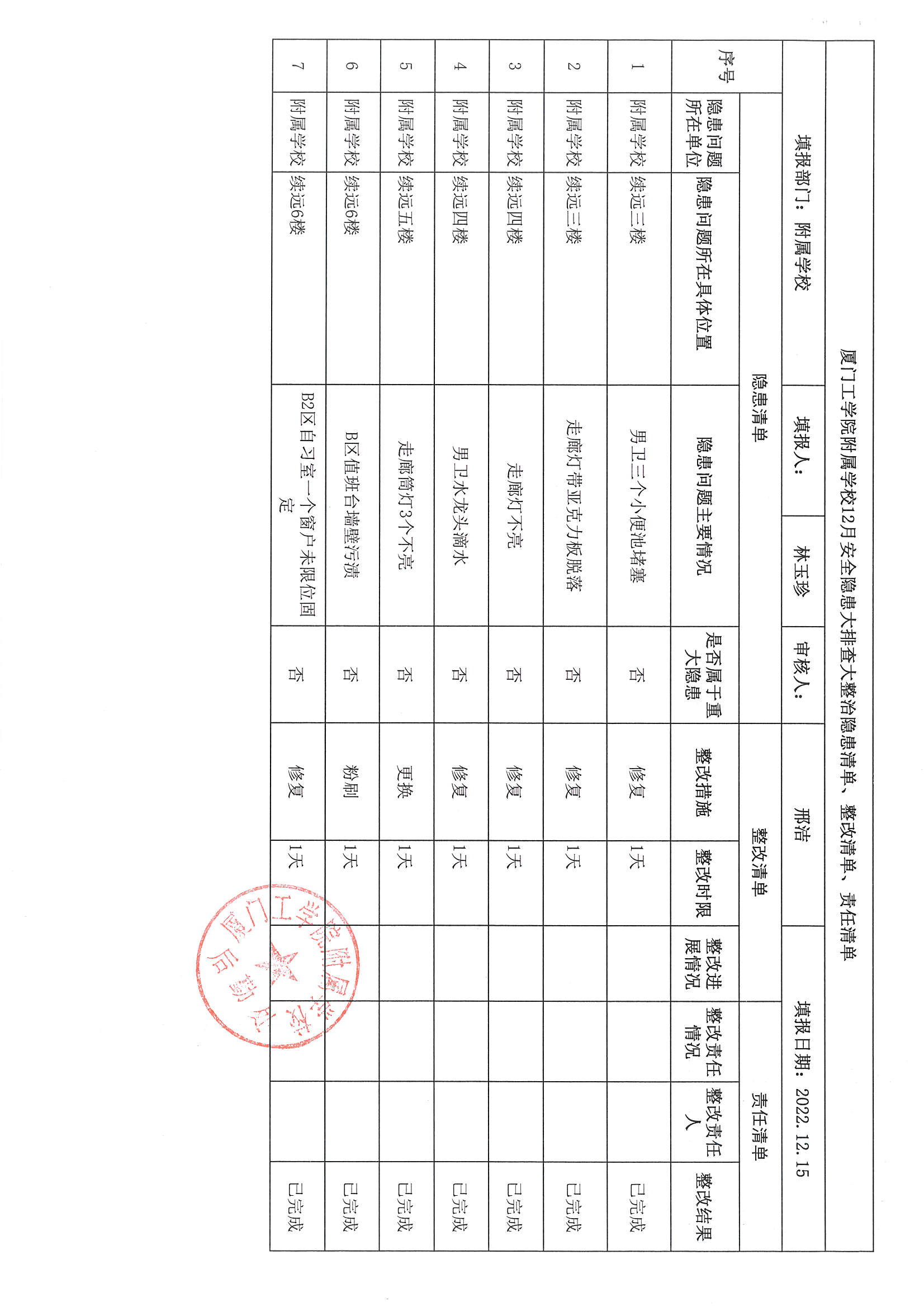 厦门工学院附属学校2022年12月份安全隐患大排查大整治隐患清单、整改清单、责任清单