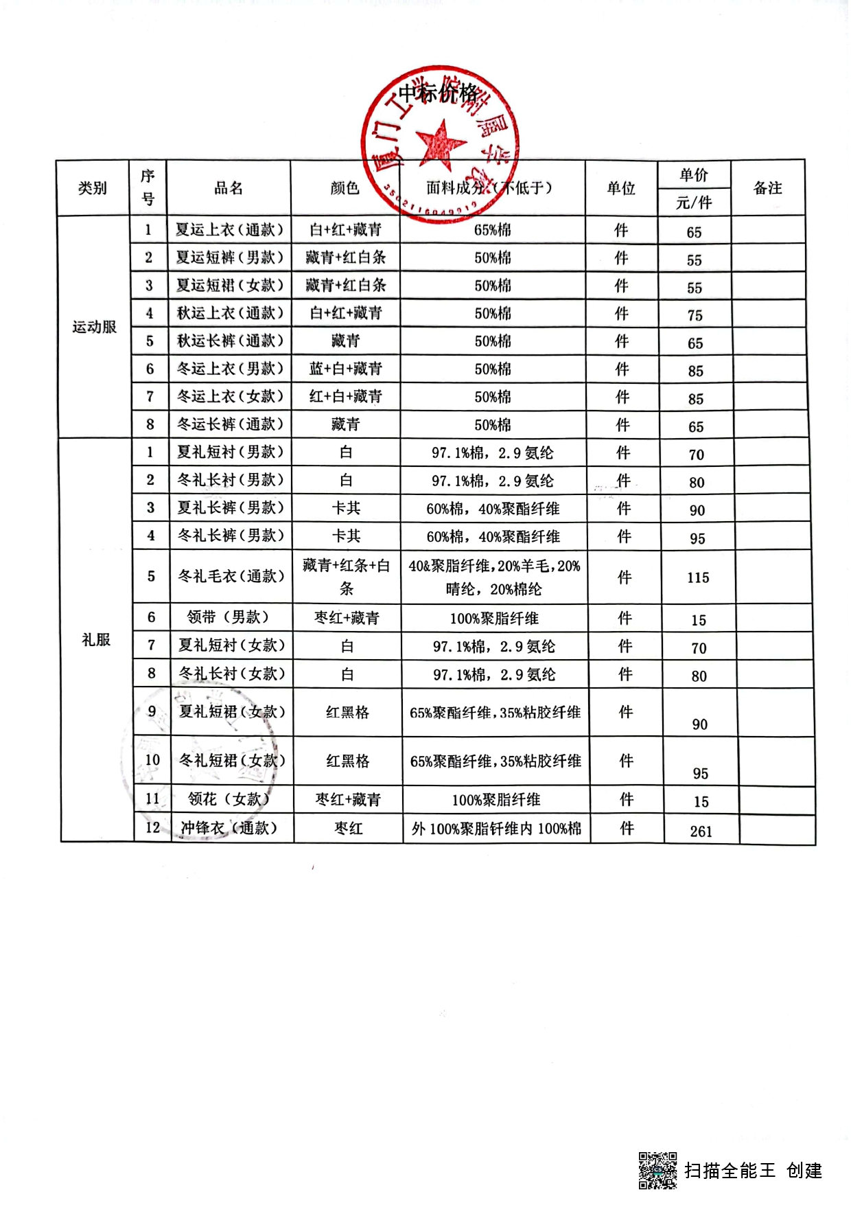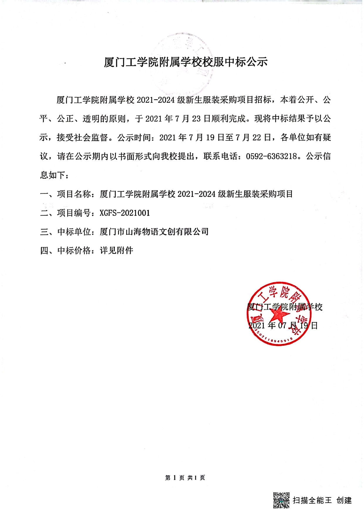 厦门工学院附属学校2021-2024级新生服装采购中标公告