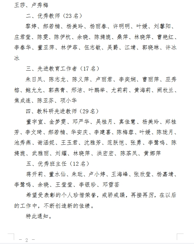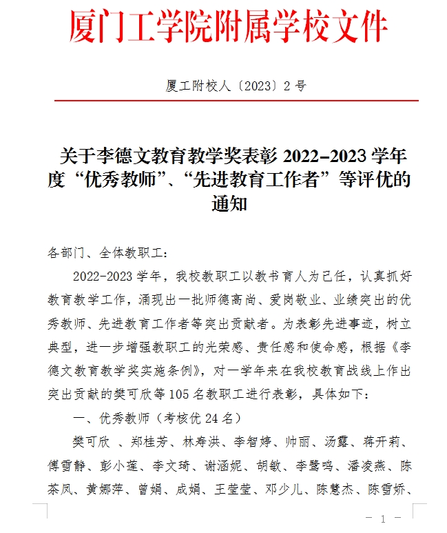 厦工附校人〔2023〕2号 关于表彰2022-2023学年度“优秀教师”、“先进教育工作者”等评优的通知