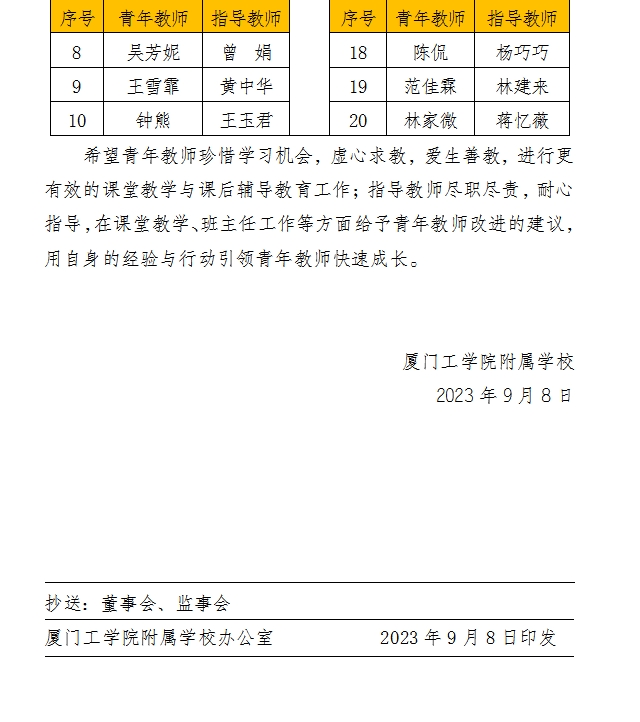 厦工附校人〔2023〕3号 关于厦门工学院附属学校2023-2024学年开展“青蓝结对”工程的决定