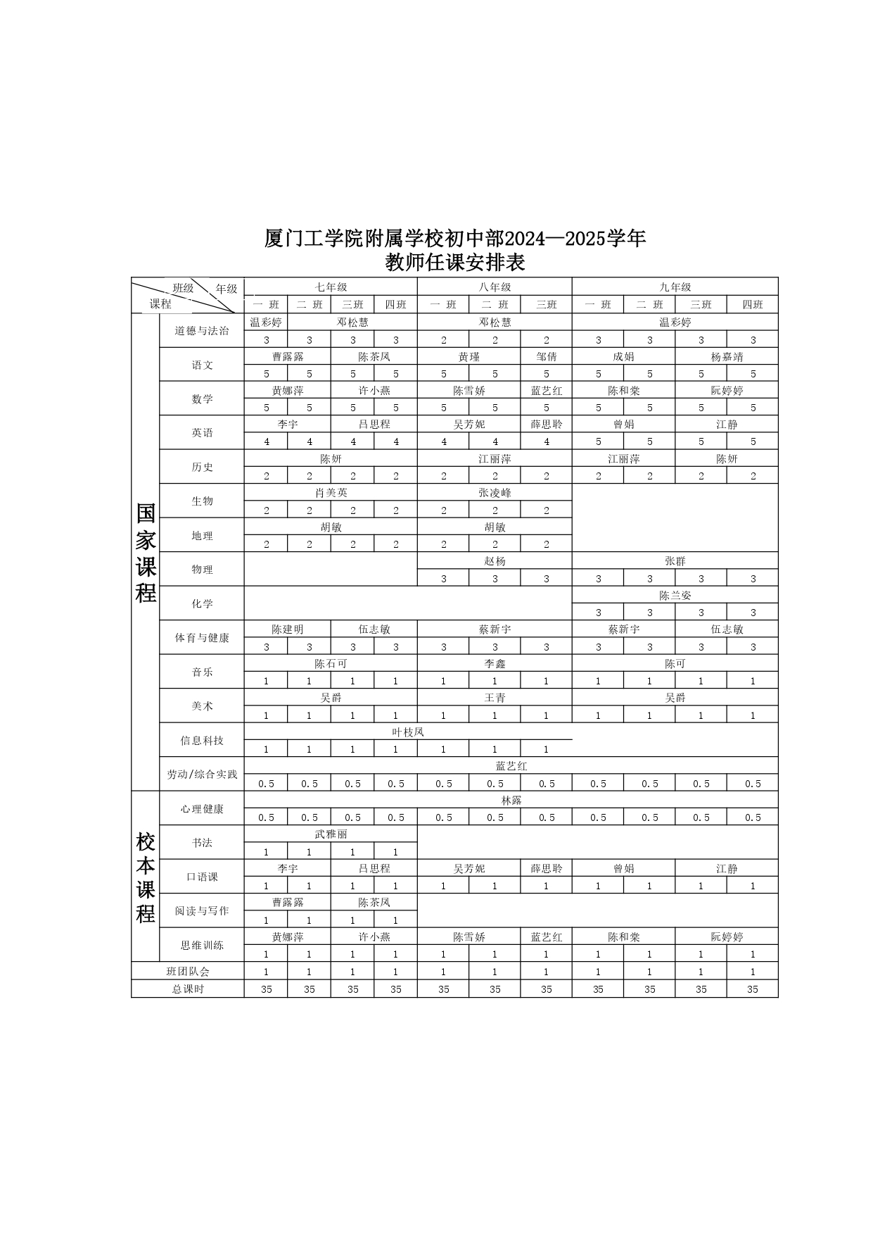厦门工学院附属学校初中部2024—2025学年教师任课安排表