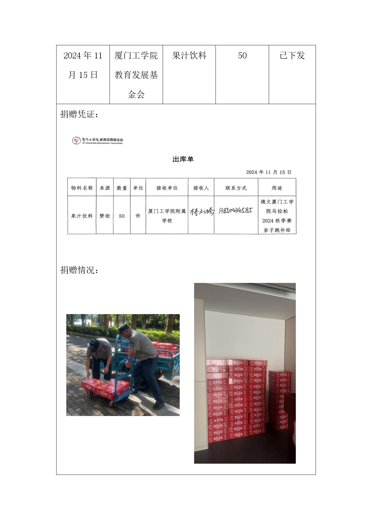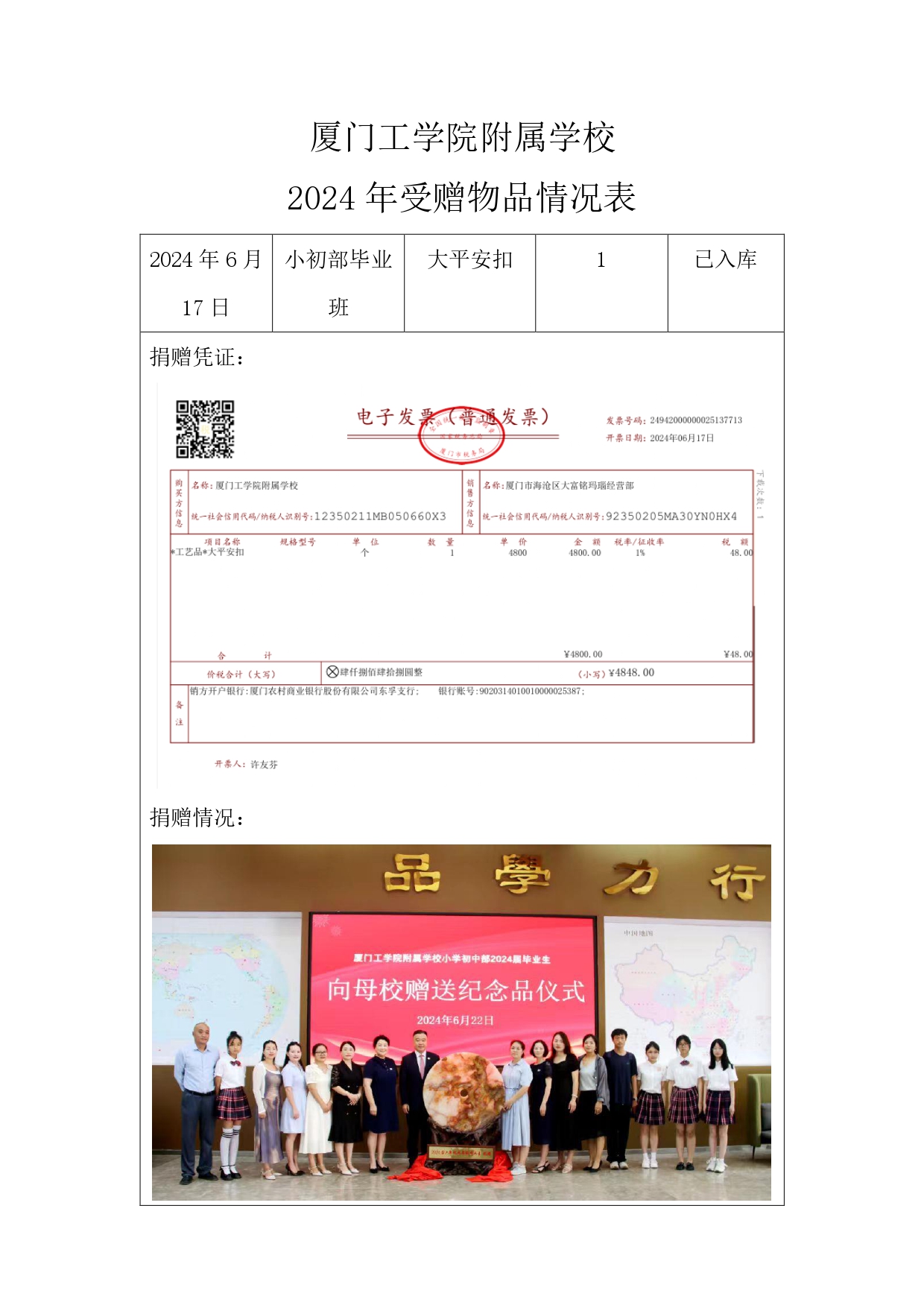 厦门工学院附属学校2024年受赠物品情况表