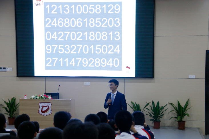 12月7日下午,李俊成老师亲临我校,面向我校高一年段全体学生开展了一场《破解记忆方程式》的讲座,本场讲座由教务处副主任王玉君老师主持。在揭开记忆方程式的神秘面纱之前,讲座开始前先进行了个互动小游戏:主持人邀请男女同学各6名、老师3名,站成一排,每人依序随机报出一组4位数字,后台工作人员同步地将数字采集录入电脑,电脑屏幕上便出现了一长串的数字。正当大家感慨这么长的一串数字要是都记下来,不知要花多长时间的时候,李俊成老师已经把他瞬间记忆的成果展示在屏幕中了。“只字未差”,太神奇了!最不可思议的是,李老师还能倒着背出来,并且“倒背如流”。现场掌声雷鸣,经久不息。开发无限潜能,挑战最强大脑,最强大脑,魔力神奇!现场师生心服口服,以百倍的专注力投入到接下来的讲座中。