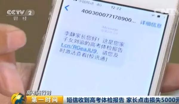 央视财经(《第一时间》)曾经报道过有关高考“木马”诈骗的骗局,重庆九龙坡区的李女士,她的女儿于2016年参加高考。在女儿参加高考前夕,她的手机突然收到一个陌生号码发来的短信,说是可以查看女儿的高考体检报告。可是,李女士点开链接以后,银行卡上的五千元钱竟不翼而飞。