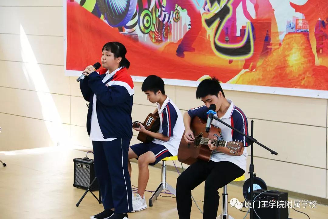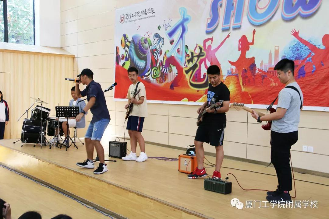 最后出场的是学生自组的乐队,音乐原子社团中的鼓手高一(4)班黄霆鋆、吉他手中英B班钟嘉豪、贝斯手中英A班黄至宇、主唱中美高二陈伟嘉、中英B班钟亦飞精彩演绎了一曲《离开》,为大家带来了视觉和听觉的盛宴。当乐声想起,全场师生瞬间被点燃,不由自主地跟着音乐的节奏舞动身体。