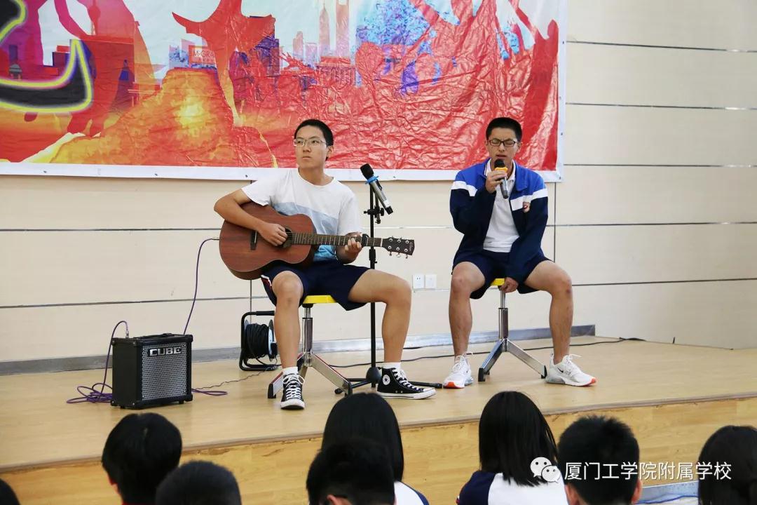 高一(1)班的尹知行和罗宏凌同学演唱歌曲《追光者》,愿你能在这并不完美的尘世,做一个有责任有担当的人,勇敢追光。
