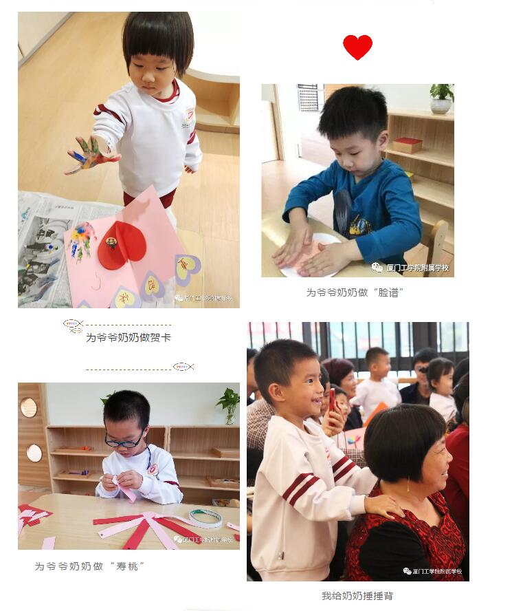 厦门工学院附属学校幼儿园的全体教师们,精心准备,忙碌了一天,陪伴孩子和家长们度过了特别有意义的一天。在重阳节这个特殊的节日里,我们也希望通过这样一系列的活动让孩子们学会从小事做起,从我做起,懂得关心老人,学会感恩,真正让尊老、敬老、爱老的种子在孩子们幼小的心田里生根,发芽!
