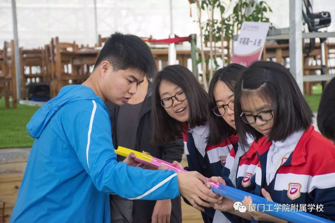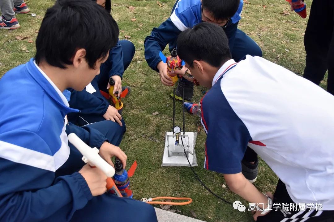 午饭后,教练带领同学们进行水火箭动力实验课。同学们在教练的指导下精心制作模型,打气助推。当火箭发射出去的一刻,大家都不约而同地“哇”地一声,为自己动手制作的成果鼓掌欢呼!
