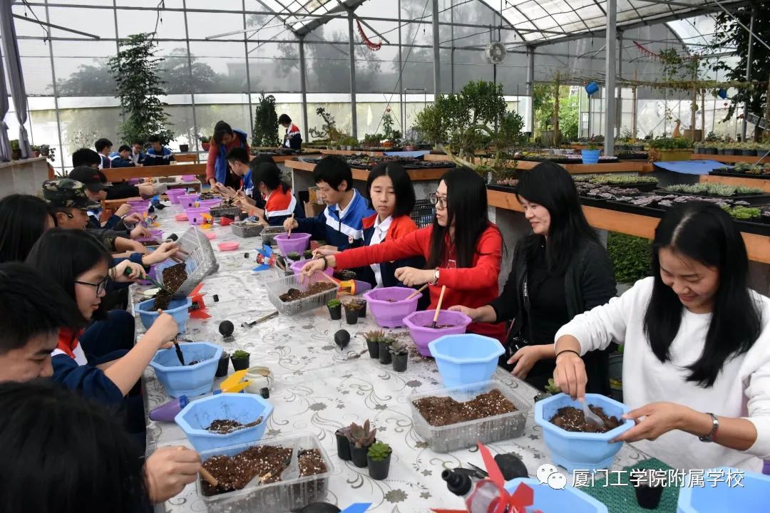 同学们在教练的指导下协作互动,认识沙生植物形态,动手制作创意盆景。领一个钟爱的花盆,捧一把五颜六色的石子,种几株形态各异的多肉植物,一土一铲种下对未来的期望与向往。