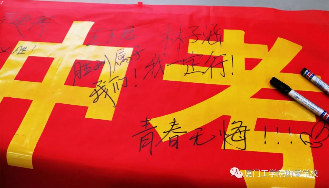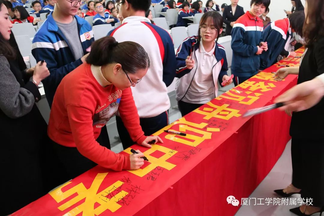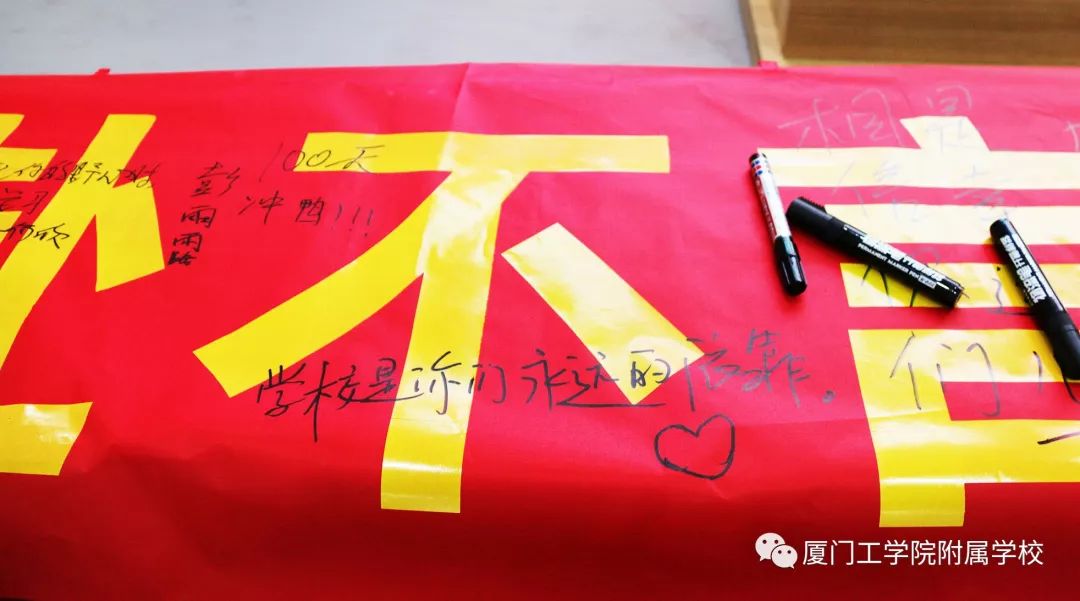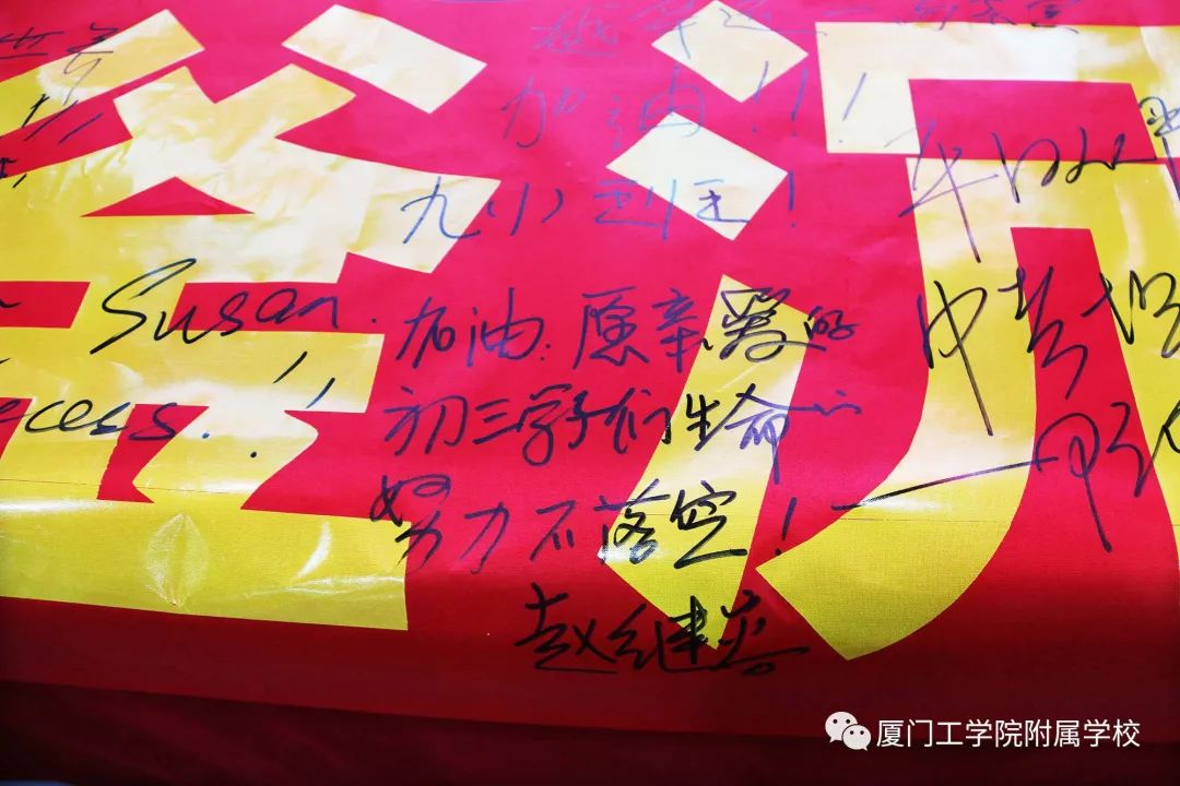 接着九年级学生集体宣誓,郑重承诺:一定会刻苦学习,努力奋斗,顽强拼搏,自强不息!将争分夺秒,奋战百日,破釜沉舟,争创辉煌!七八年级的学弟学妹也为学长们送上诚挚的祝福,祝福他们振翅高飞,收获成功与梦想!最后,师生们纷纷在中考横幅上写下祝福语和励志语,并签名留念。
