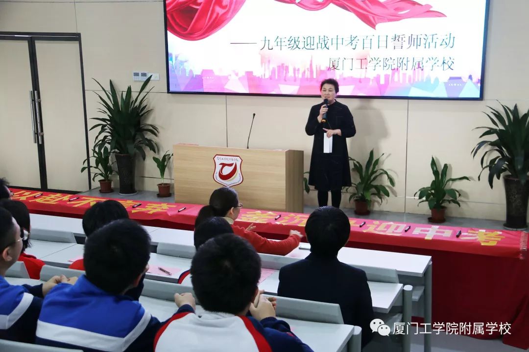 誓师大会上,学校领导、教师代表、学生代表相继作了动员讲话。赵校长用长者的谆谆教诲,勉励每一位九年级学子要谨记目标,勤奋努力,唱响附校首届中考的凯歌,为厦工附校的升学史册画上一笔辉煌。教师代表成娟老师用激情澎湃的语言,激励学生以高昂的斗志,百倍的信心,坚定的信念,全身心地奋战中考,以优异的成绩,圆自己的青春梦想。学生代表冯紫萱代表全班同学表明决心:奋斗一百天,圆自己心愿;奋斗一百天,给老师一个满意的答案;奋斗一百天,给家长、学校和社会一个满意的答卷。