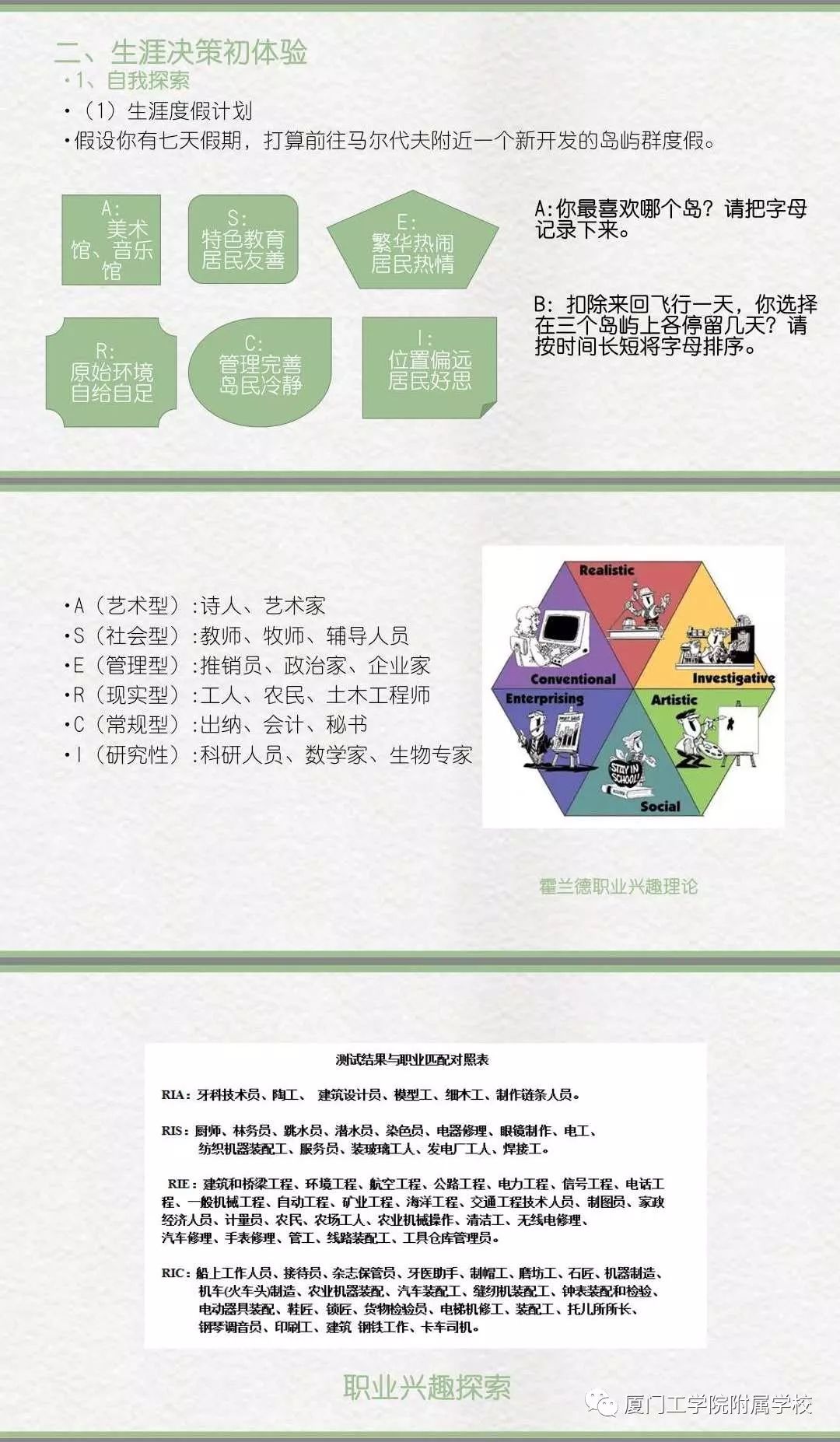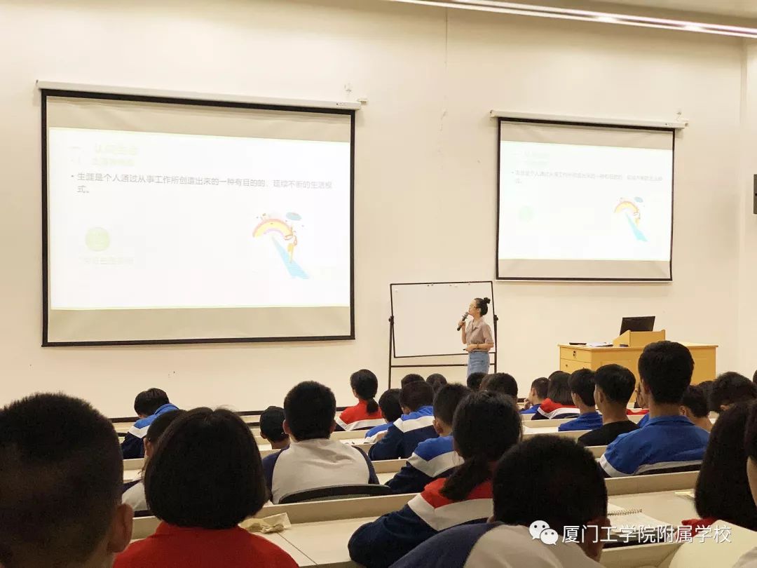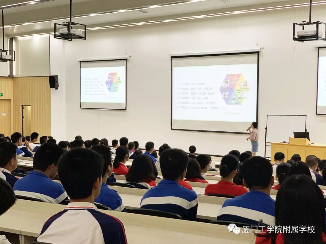 讲座最重要的部分是“职业生涯初体验”,在这个环节里,廖老师带领大家通过活动、心理测试等不同的形式对自我的性格、能力、兴趣和价值观进行了体验性探索;以“厦门大学”为例介绍了解专业和大学的途径;以“教师”为例分析对职业进行了解时需要获取哪些方面的信息。现场不时响起讨论声和欢笑声,很多同学都说通过这些活动让自己更加了解自己,也促进了自己对高中生涯的思考。